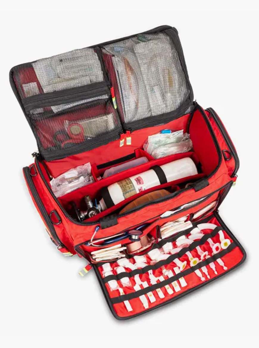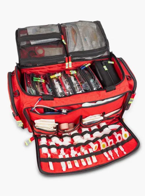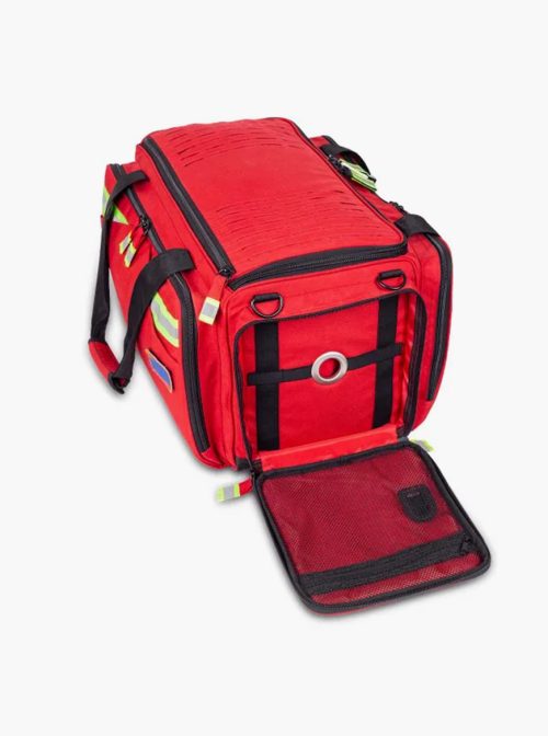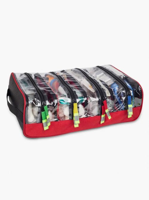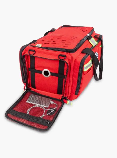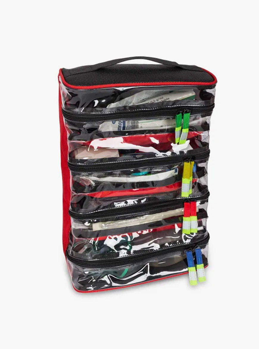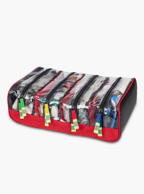 – Painel extraível com 4 divisões com puxadores de cores segundo o código de cores internacional: azul (respiratório), encarnado (circulatório), verde (cirúrgico) e amarelo (pediátrico);