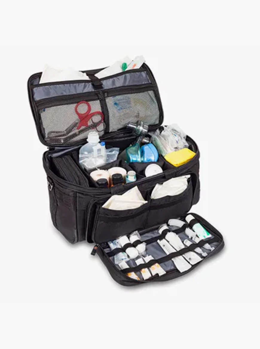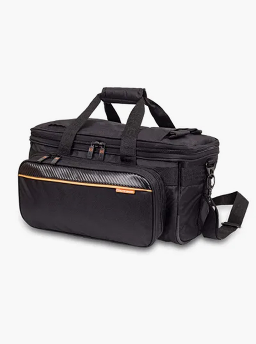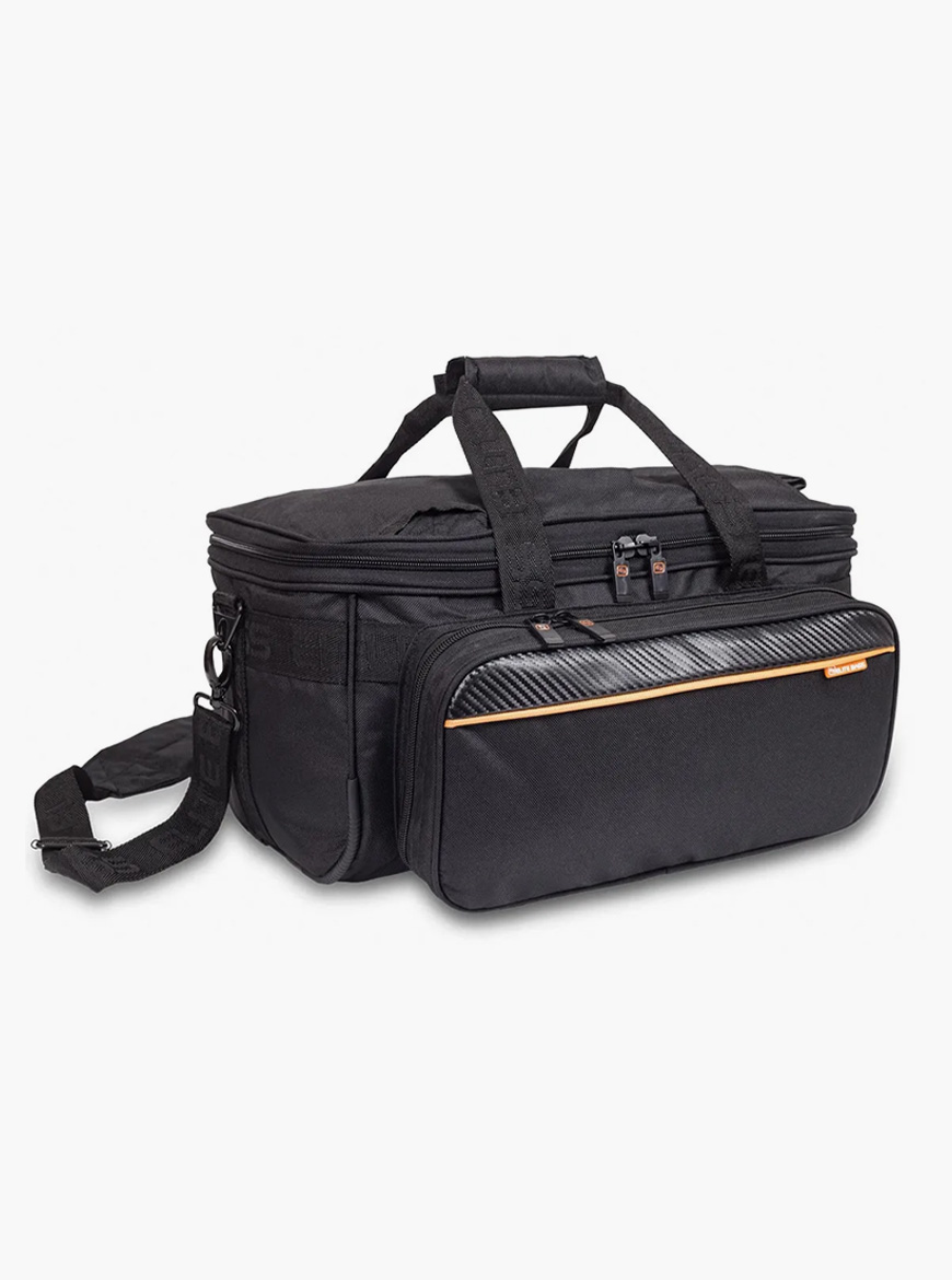 – Compartimento frontal com dois bolsos de grande capacidade e um painel de cintas elásticas
