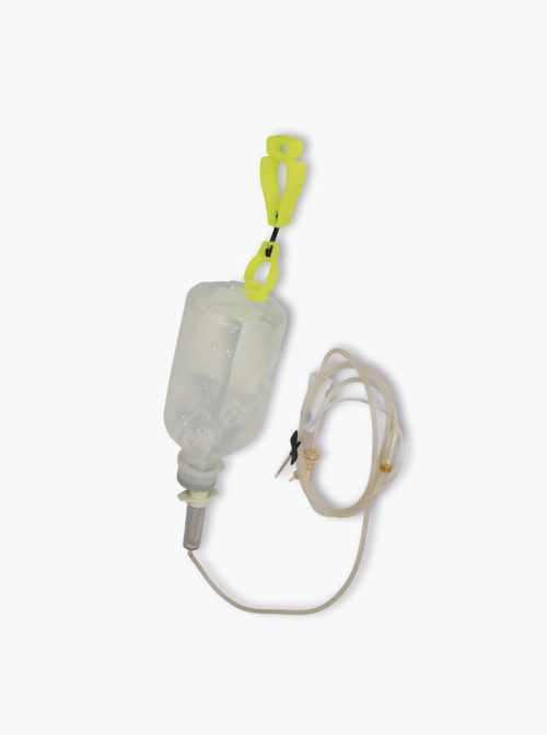 – Dois ganchos, de alta pressão, capazes de segurar frascos, sacos e diferentes embalagens de soro até 1000 ml, entre outros, em superfícies fixas ou na roupa, durante o transporte de emergência de um doente crítico.