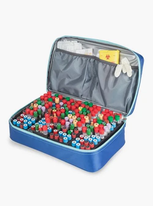 – Quatro suportes de tubos de espuma individuais, cada um com capacidade suficiente para 44 tubos de recolha de sangue.