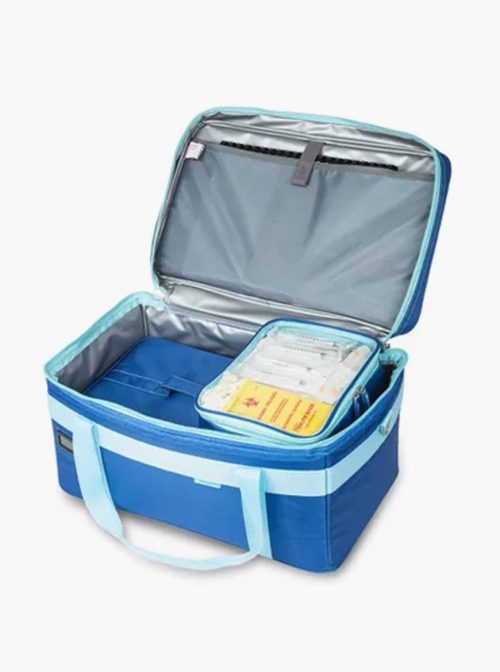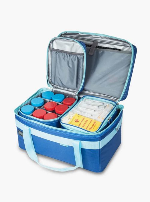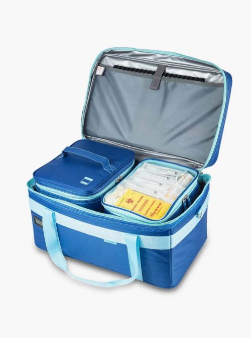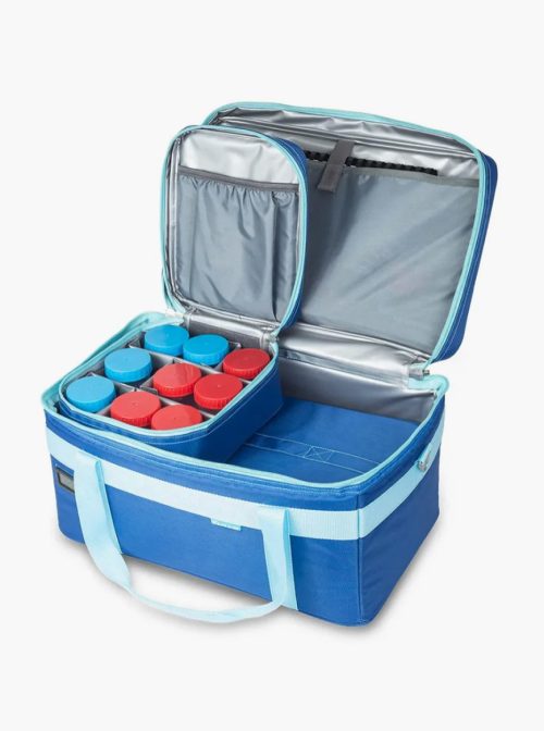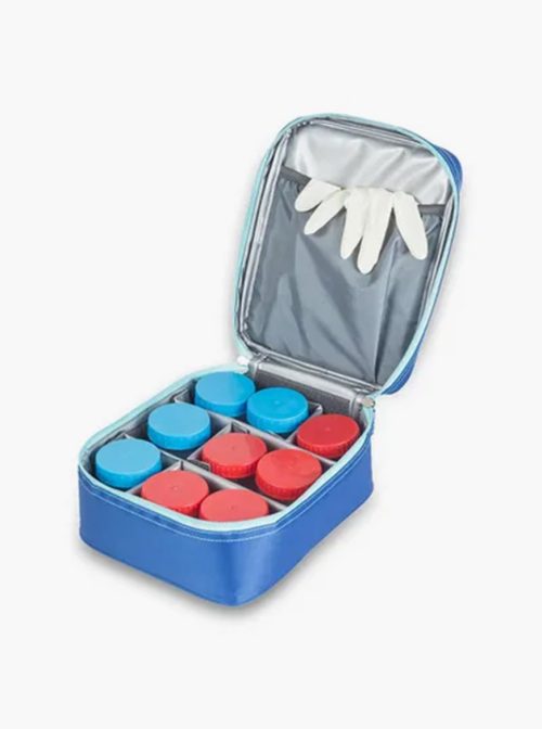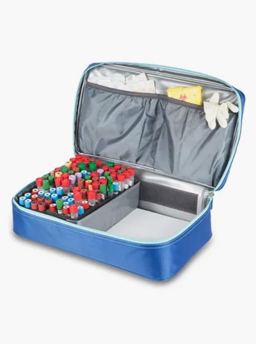 – Bolsa de amostras de urina e fezes com divisórias móveis e amovíveis para configurações flexíveis e espaço para 9-12 recipientes.