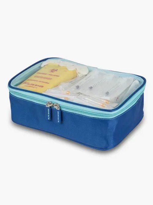 – Bolsa de equipamento com frente transparente para transportar recipientes de bolso para material cortante, seringas, agulhas, EPI e outros materiais associados.