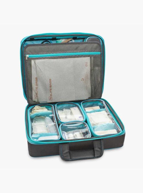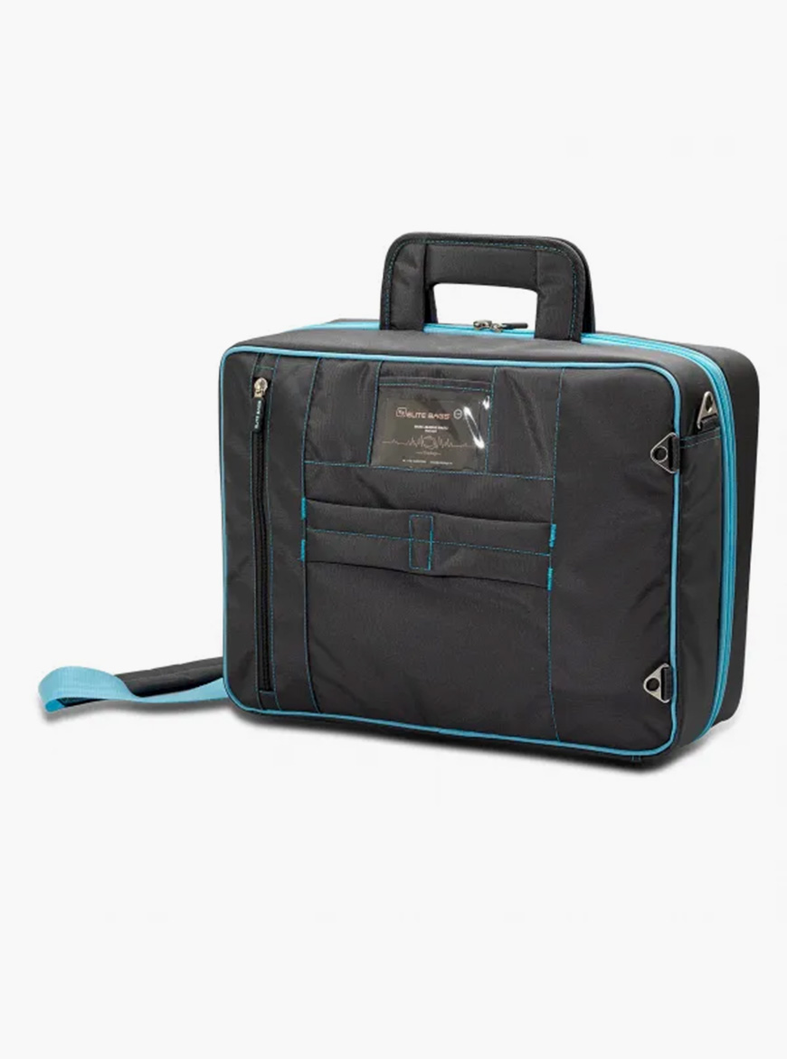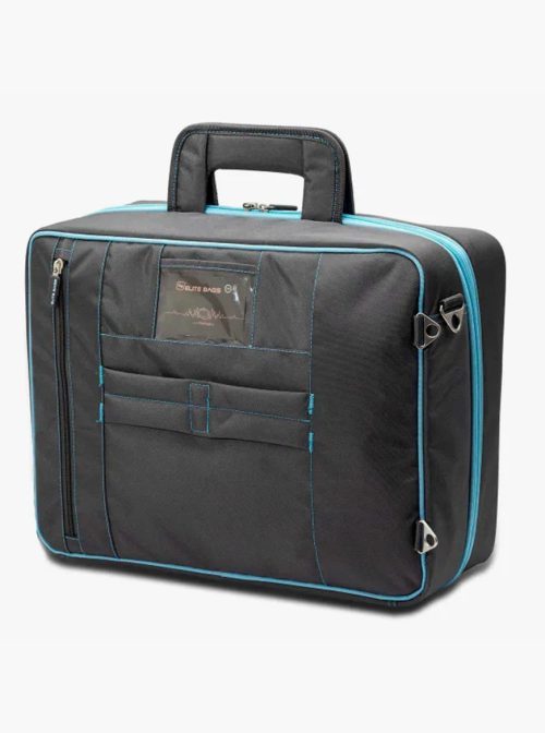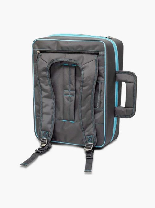 – Interior dividido por uma aba central com um bolso de rede resistente, com fecho de correr de um lado e bandas elásticas, dois bolsos pequenos com fecho e uma bolsa para instrumentos amovível do outro.
